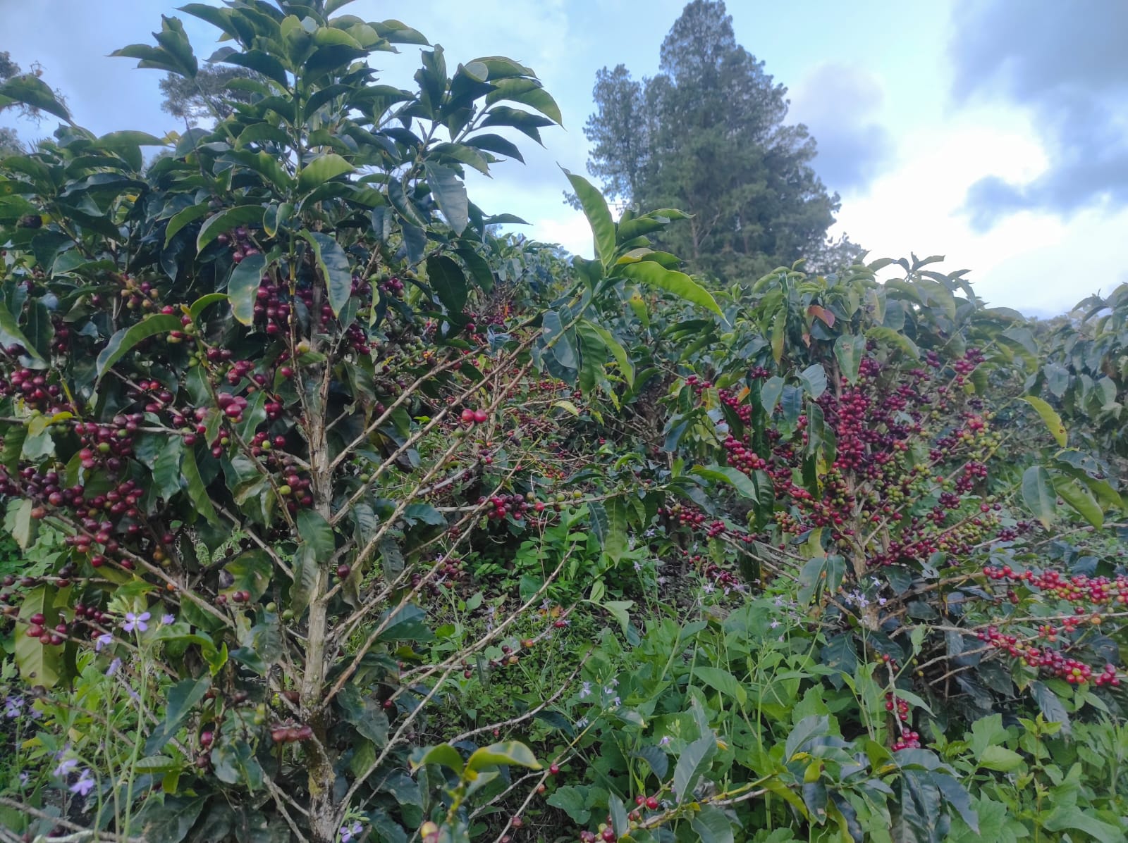 The family cultivates Cenicafé 1 (20%) and Colombia variety (80%), caring for the trees during the early months of the year when the soil needs feeding, insects are managed with rice-based fungi, and the companion plants around the coffee are thoughtfully maintained.